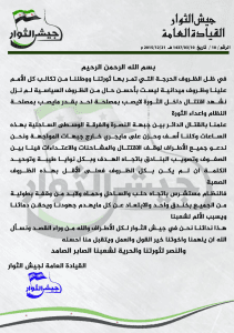 دعوة جيش الثوار للفصائل الثورية لوقف الاقتتال الدائر بينها وتوجيه البنادق نحو النظام السوري