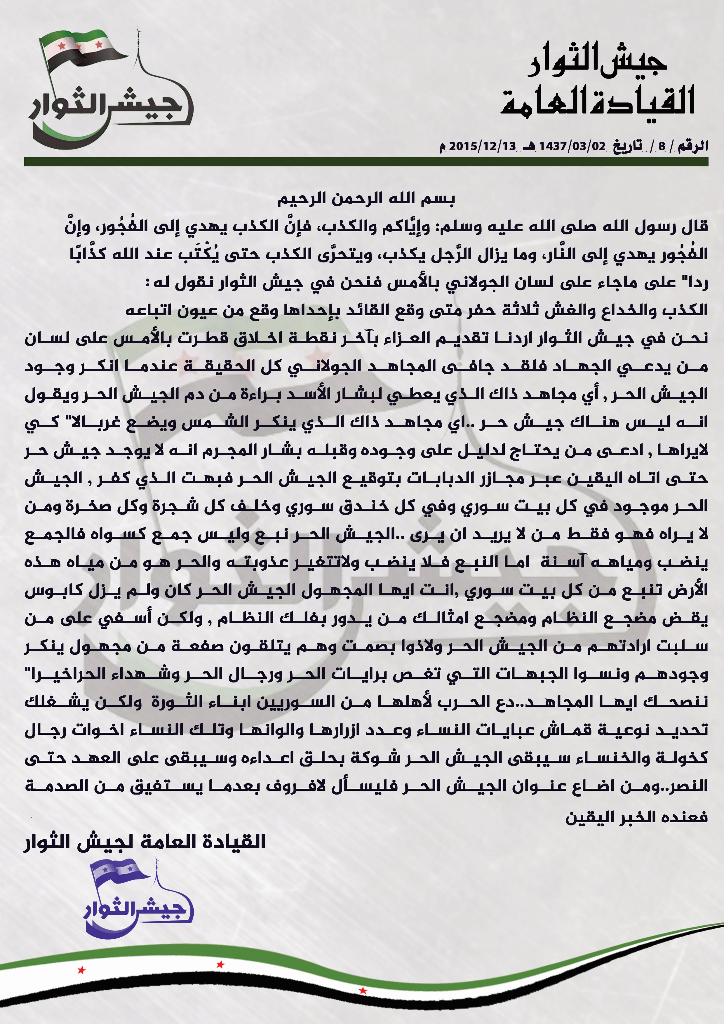 بيان من جيش الثوار حول تصريحات الجولاني عن عدم وجود شيئ اسمه الجيش الحر