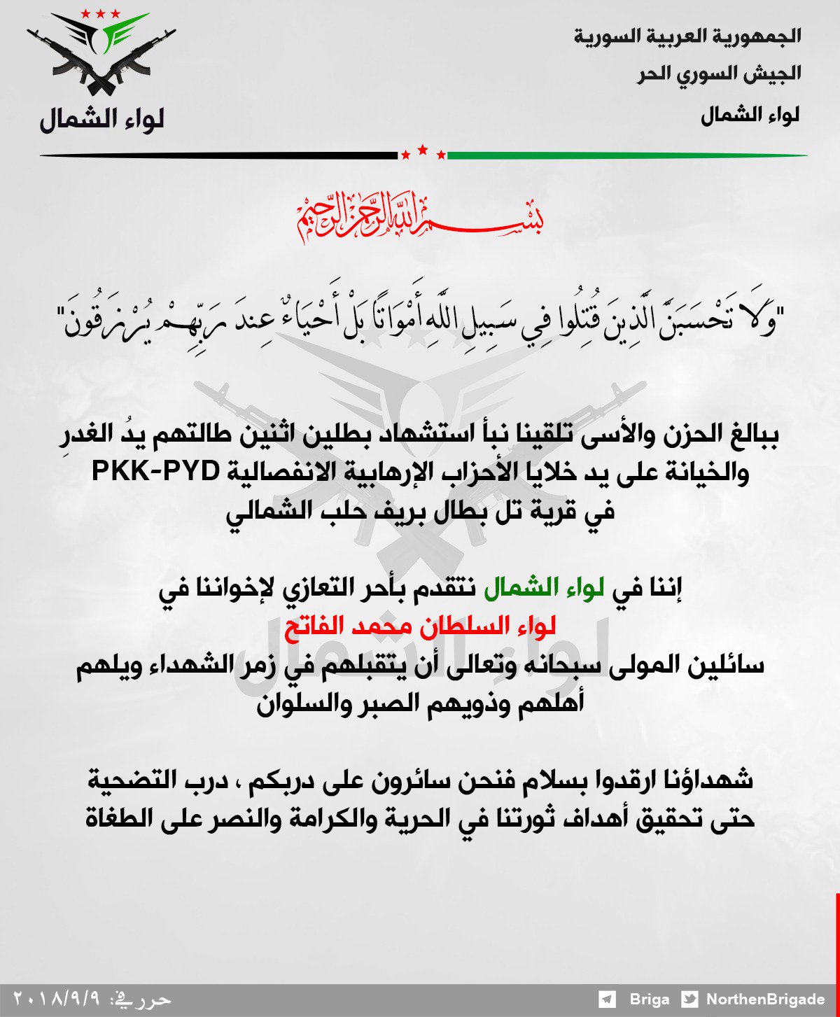 لواء الشمال يعزي لواء السطان محمد الفاتح بعدد من عناصره على تل بطال بريف حلب الشمالي