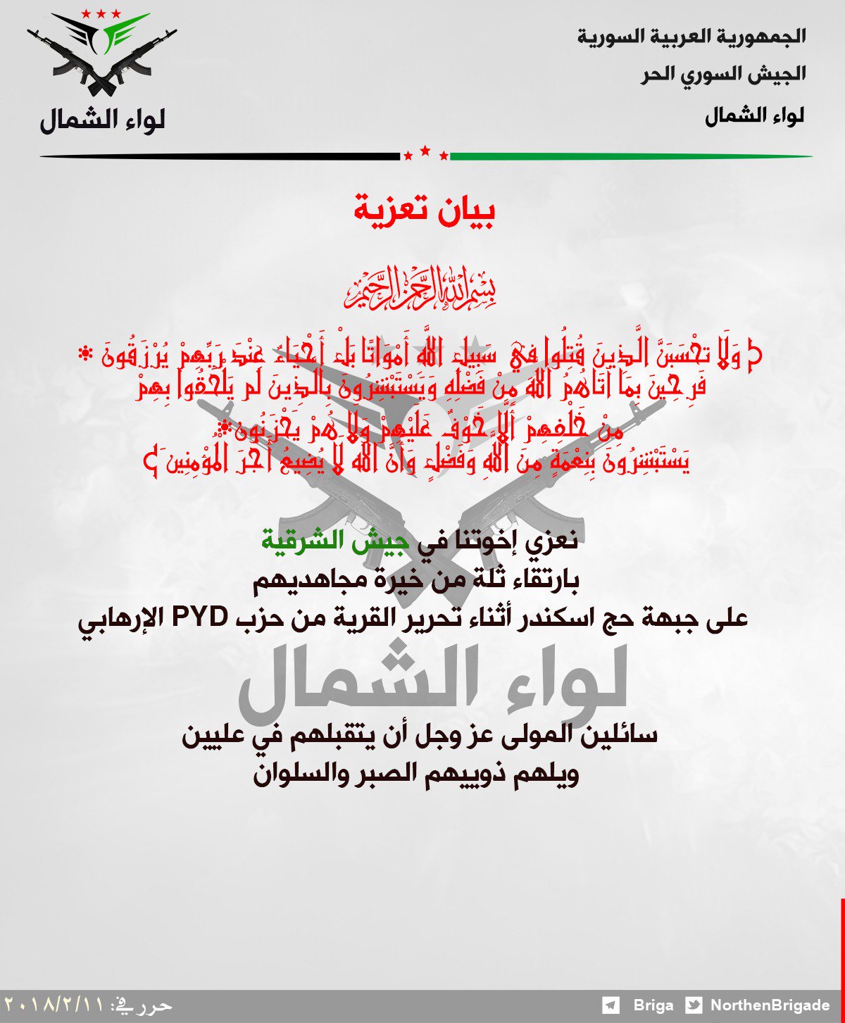 لواءالشمال يعزي جيش الشرقية بعدد من مقاتليه بريف عفرين