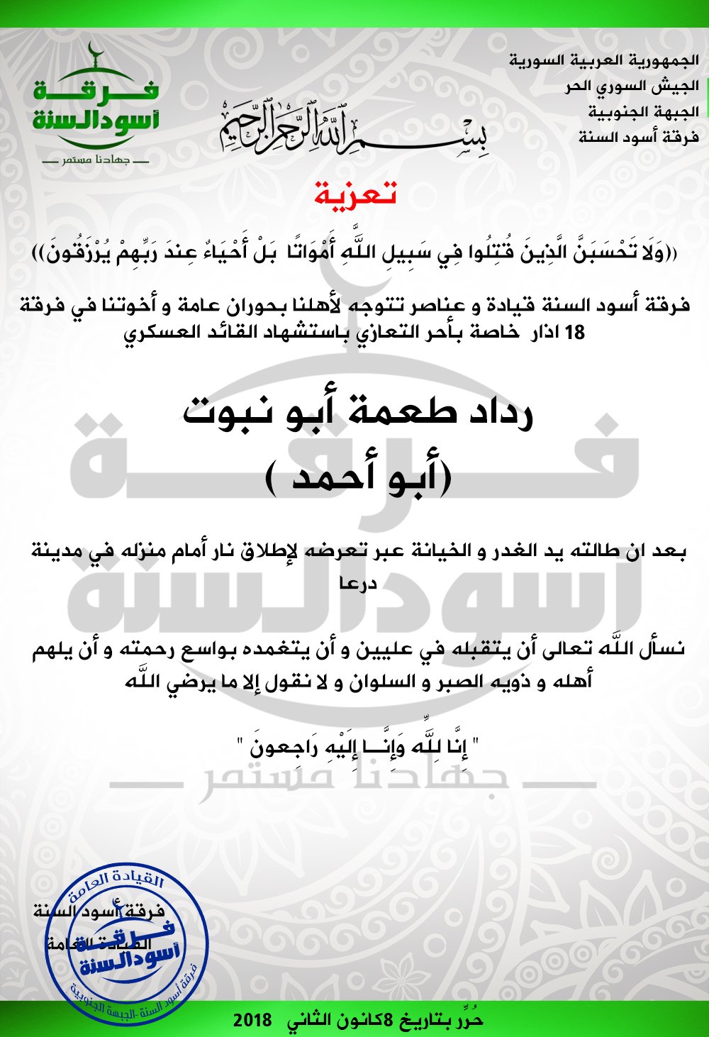 فرقة أسود السنة تعزي فرقة 18 آذار بقائدها العسكري رداد أبو نبوت