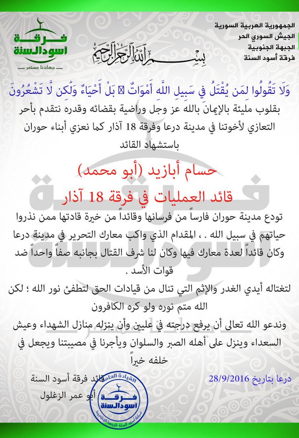 فرقة أسود السنة تعزي فرقة 18 آذار بقائد عملياتها حسام أبازيد