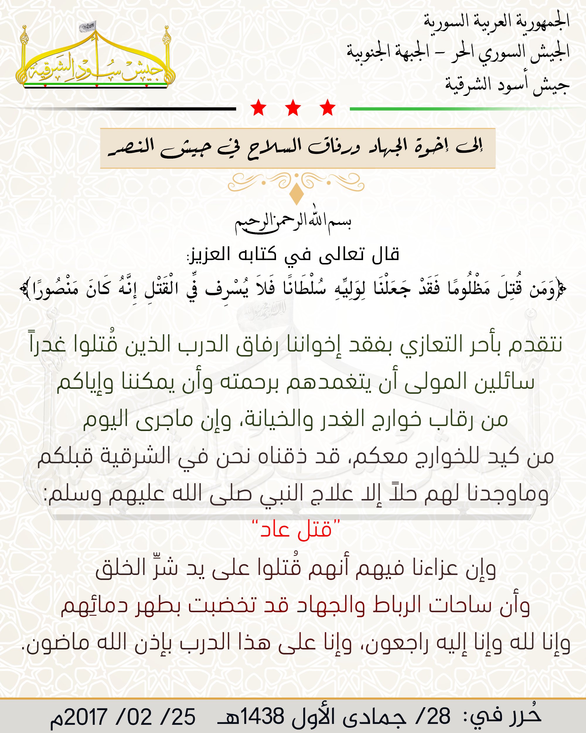 جيش أسود الشرقية يعزي جيش النصر بمجموعة من مقاتليه على أيدي تنظيم جند الاقصى