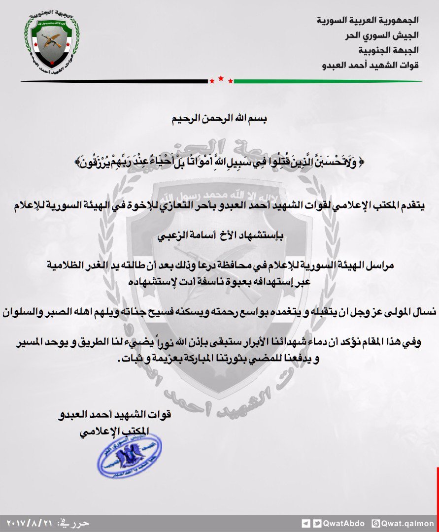 قوات الشهيد أحمد العبدو تعزي الهيئة السورية للإعلام بمراسلها أسامة الزعبي