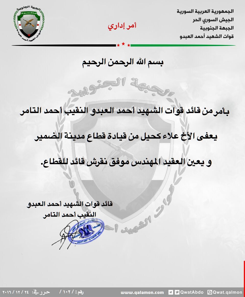 قرار إداري بإعفاء علاء الكحيل من قيادة قطاع الضمير وتعيين العقيد المهندس موفق نقرش بدلاً عنه