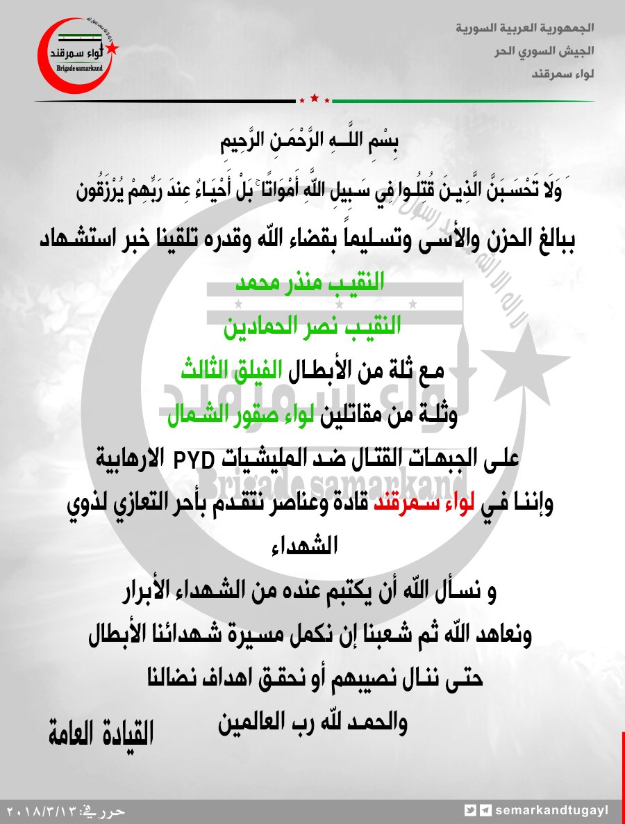 لواء سمرقند يعزي الفيلق الثالث ولواءصقور الشمال بمجموعة من مقاتليهم على جبهات الجماعات الكردية الإنفصالية