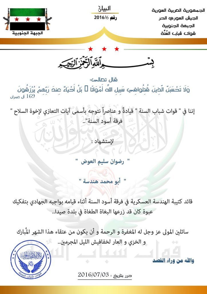 قوات شباب السنة تعزي فرقة أسود السنة بقائد كتيبة الهندسة العسكرية فيها رضوان سليم العوض