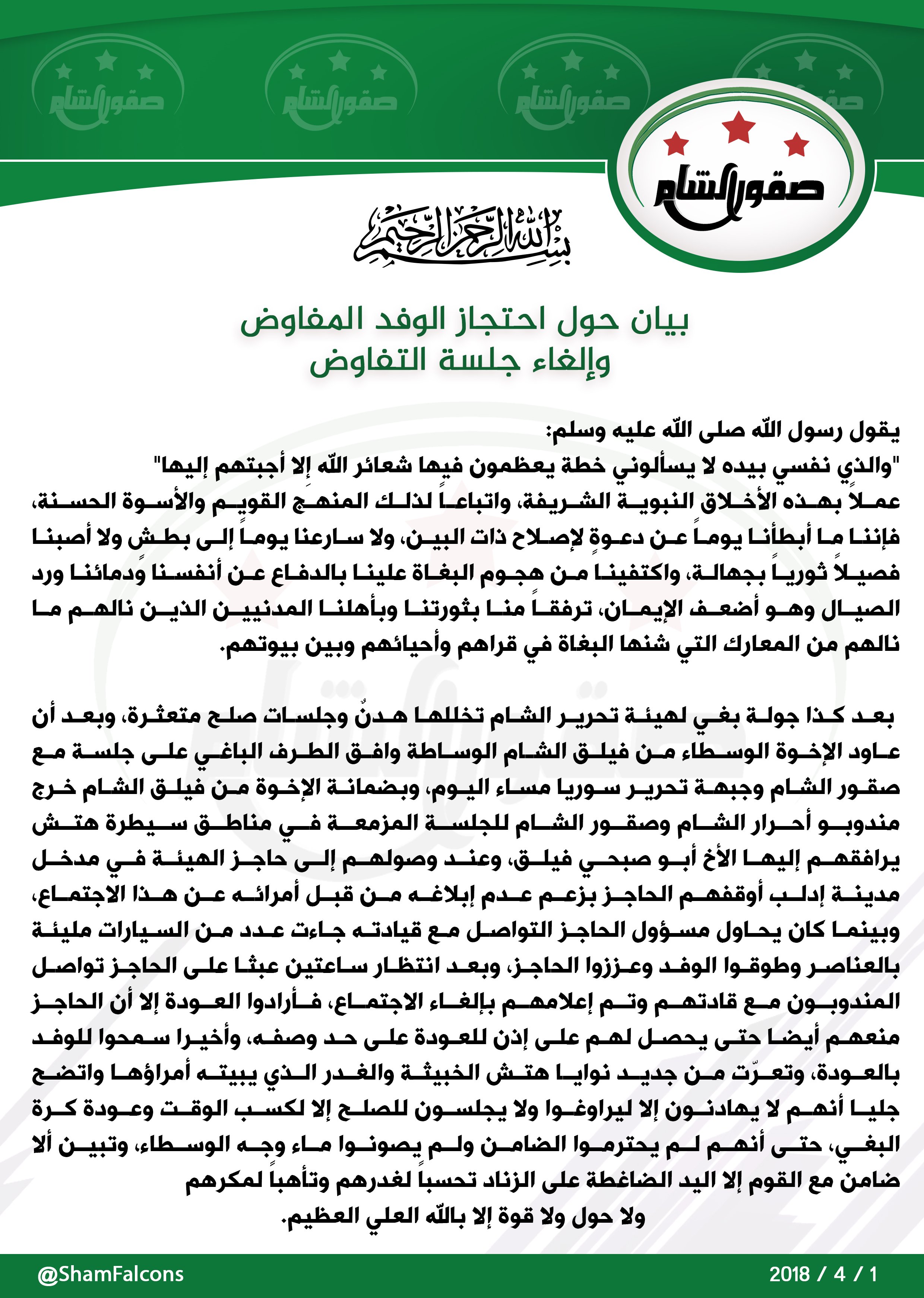 بيان ألوية صقور الشام حول احتجاز الوفد المفاوض من قبل الهيئة وإلغاء جولة التفاوض