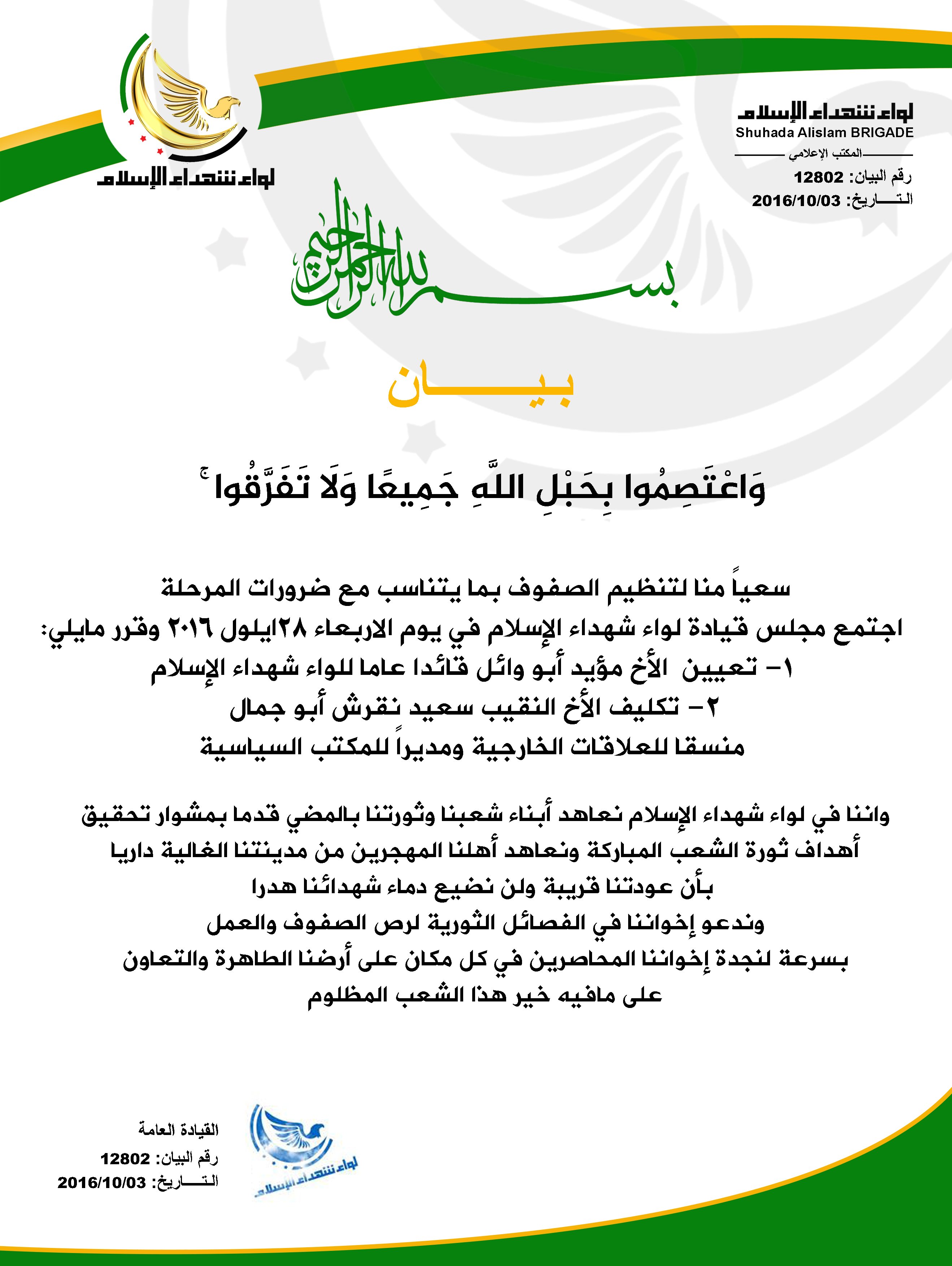 قيادة لواء شهداء الإسلام تقرر تعيين ( مؤيد أبو وائل ) قائداً عاماً للواء وتعيين ( النقيب سعيد نقرش ) مديراً للمكتب السياسي ومسؤول العلاقات الخارجية للواء