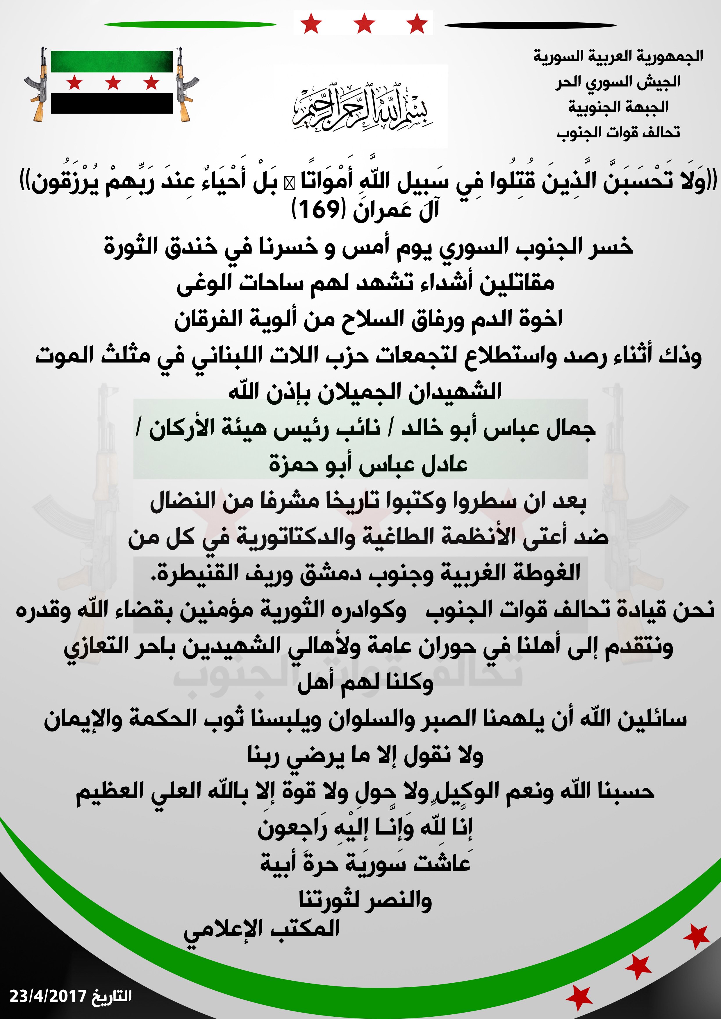 تحالف قوات الجنوب تعزي ألوية الفرقان بنائب رئيس هيئة أركانها جمال عباس