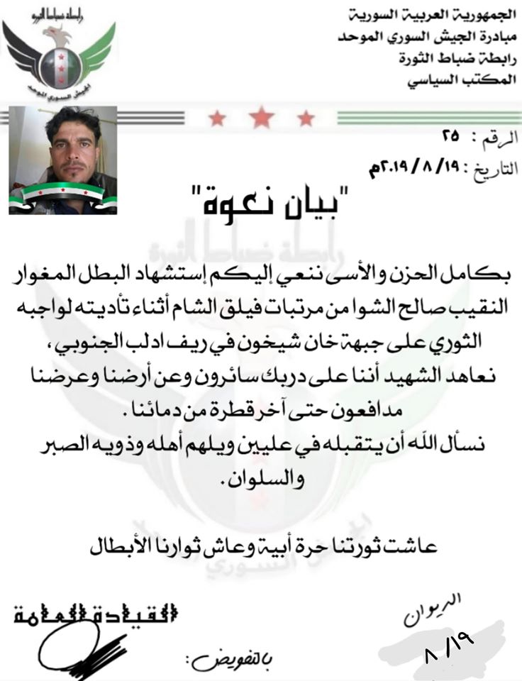 الجيش السوري الموحد يعزي فيلق الشام بالنقييب صالح الشوا في معارك خان شيخون
