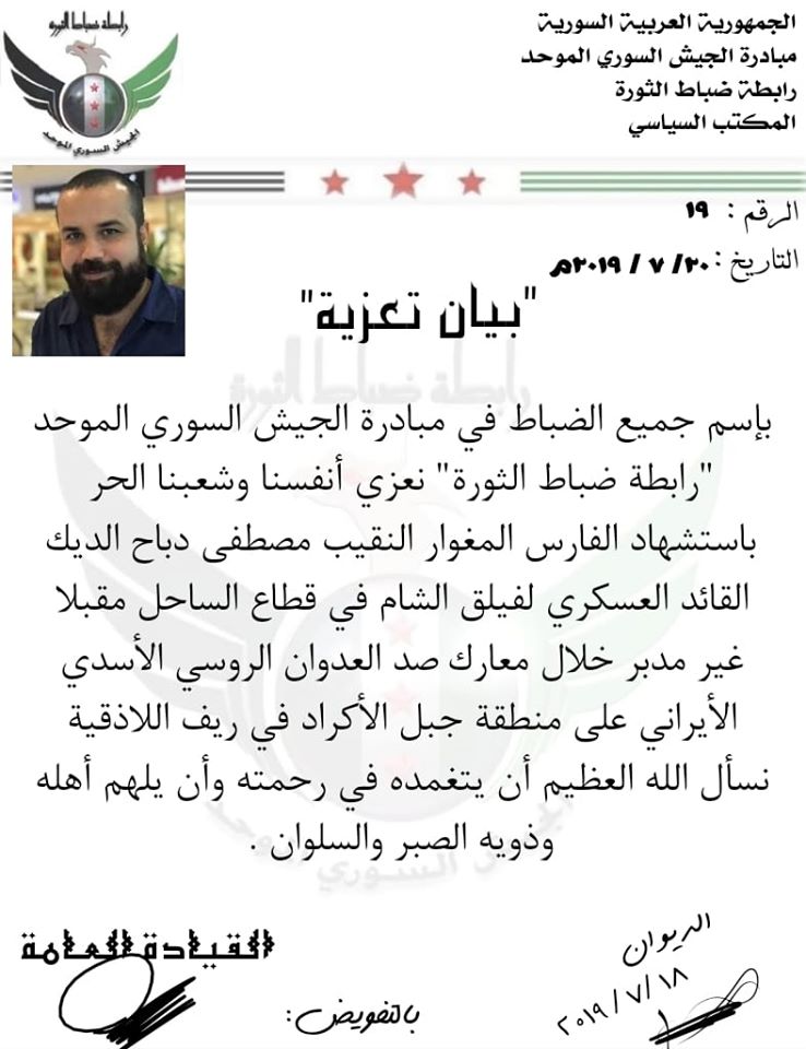 الجيش السوري الموحديعزي فيلق الشام بالقائد العسكري لقطاع الساحل النقيب مصطفى دباح الديك في منطقة جبل الأكراد