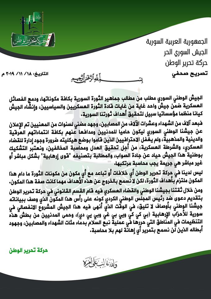قرار حركة تحرير الوطن برفع دعوة قضائية على رئيس المجلس الوطني الكردي لتشكيكه وهجومه على الجيش الوطني