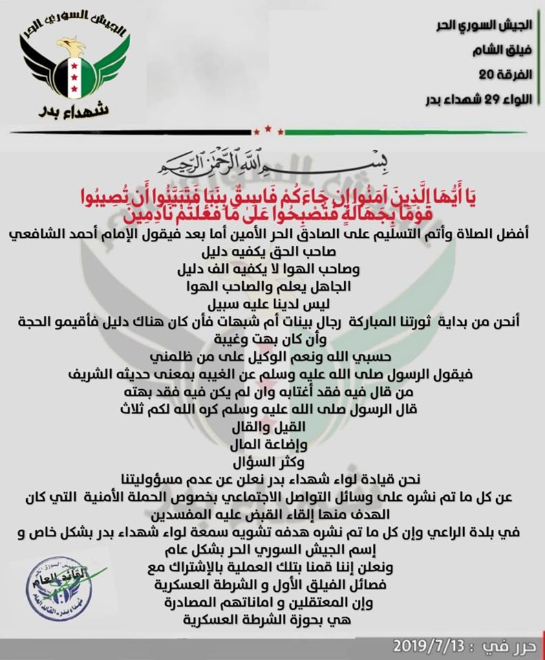 بيان من جيش شهداء بدر بشأن ما أشيع حول الحملة الأمنية ضد المفسدين في الراعي والتي نفذت بالإشتراك مع الفيلق الأول والشرطة العسكرية