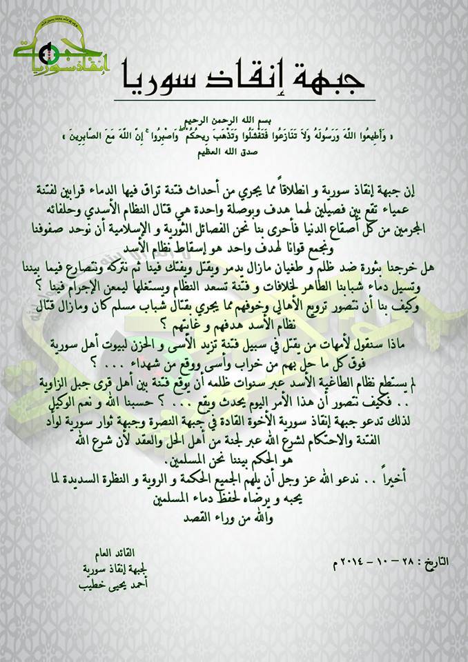 إن جبهة إنقاذ سورية و انطلاقاً مما يجري من أحداث فتنة تراق فيها الدماء قرابين لفتنة عمياء تقع بين فصيلين لهما هدف وبوصلة واحدة هي قتال النظام الأسدي وحلفائه المجرمين من كل أصقاع الدنيا فأحرى بنا نحن الفصائل الثورية و الإسلامية أن نوحد صفوفنا ونجمع قوانا لهدف واحد هو إسقاط نظام الأسد