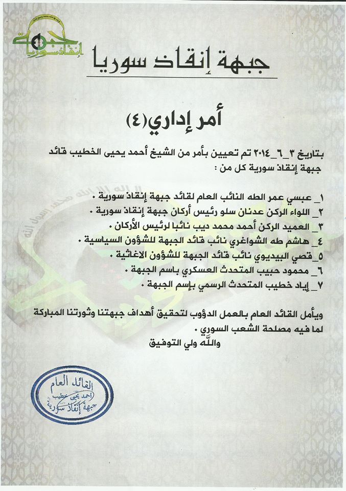 قرارات إدارية من قائد جبهة إنقاذ سورية بتعيين قيادين في الجبهة