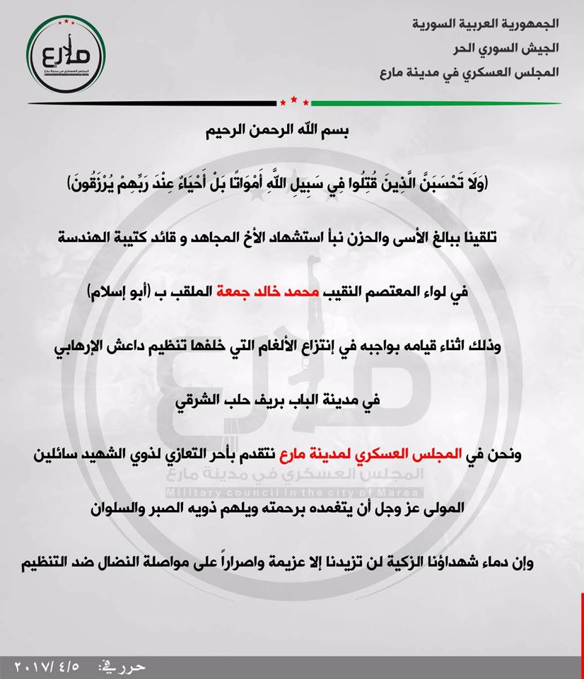 المجلس العسكري في مدينة مارع يعزي لواء المعتصم بقائد كتيبة الهندسة محمد خالد جمعة