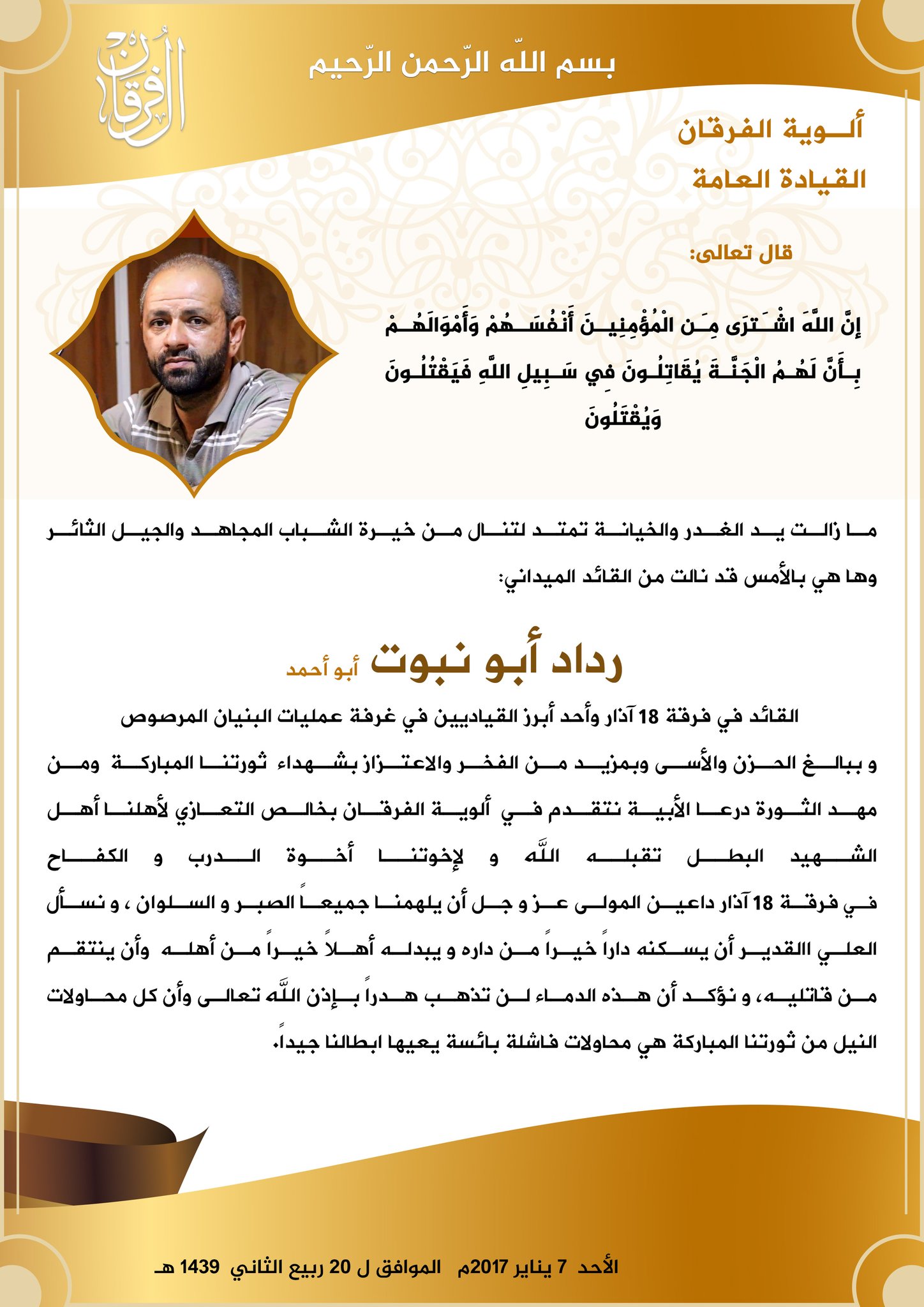 ألوية الفرقان تعزي فرقة 18 آذار بالقائد رداد أبو نبوت