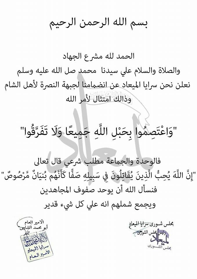 سرايا الميعاد تعلن انضمامها إلى صفوف جبهة النصرة
