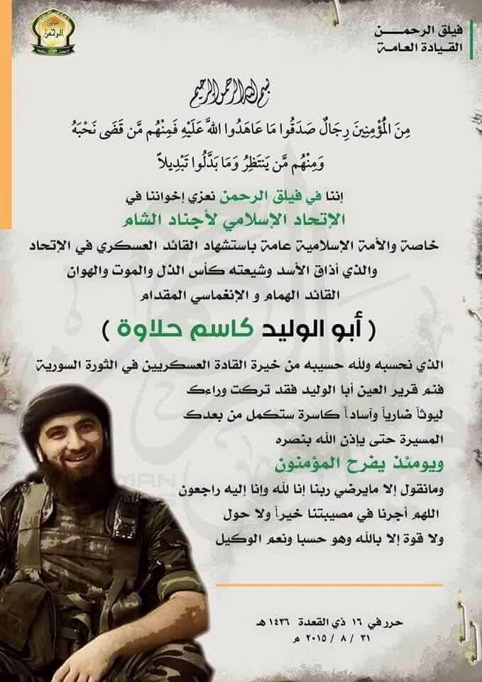 فيلق الرحمن يعزي الإتحاد الإسلامي لأجناد الشام بالقائد العسكري كاسم حلاوة أبو الوليد
