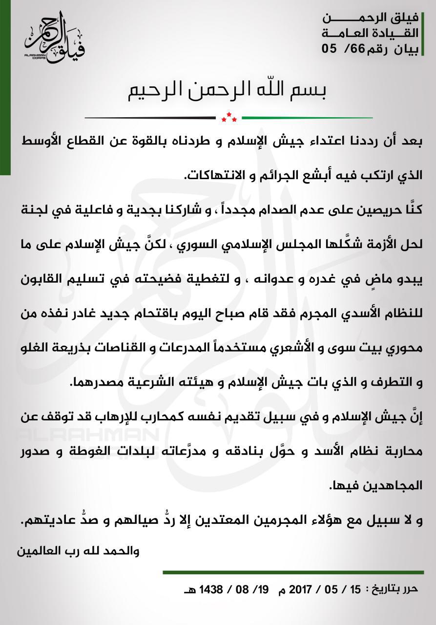 بيان من فيلق الرحمن حول تجدد هجوم جيش الإسلام على محور بيت سوى والأشعري