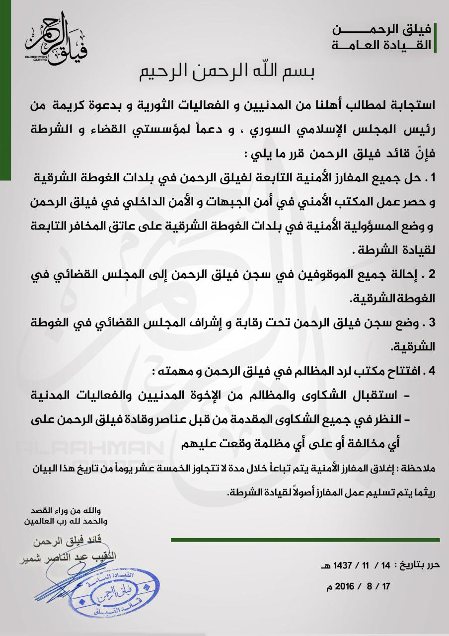 فيلق الرحمن يقرر حل جميع مفارزه الأمنية استجابة لمطلب أهالي الغوطة والمجلس الإسلامي السوري