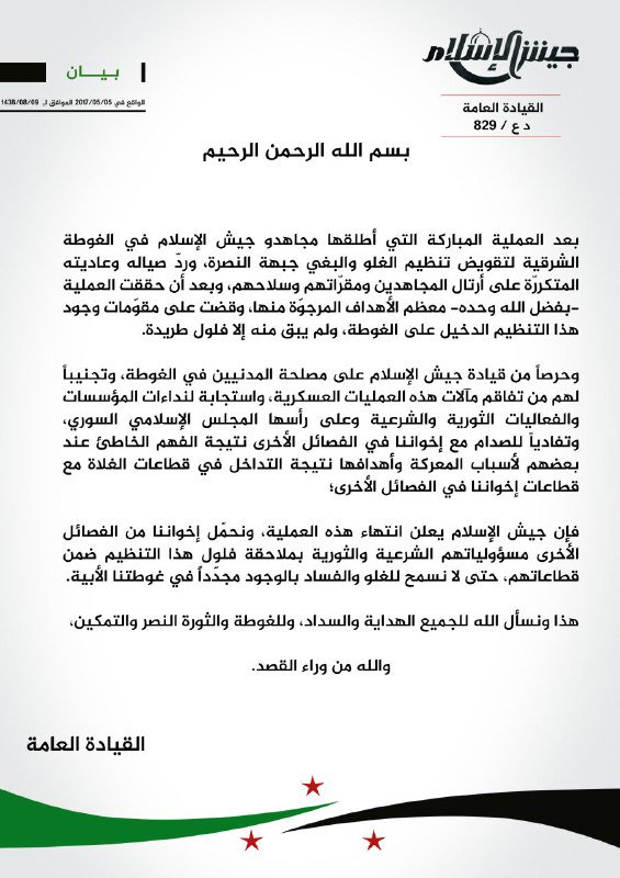 بيان من جيش الإسلام حول انتهاء عملياته العسكرية ضد هيئة تحرير الشام في الغوطة الشرقية