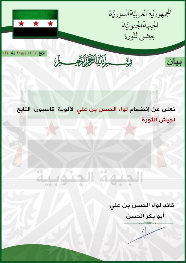 جيش الثورة يعلن انضمام لواء الحسن بن علي إلى صفوف ألوية قاسيون التابعة له