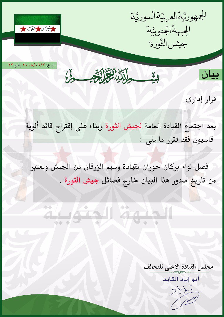 جيش الثورة يقرر فصل لواء بركان حوران من الجيش