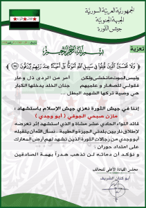 جيش الثورة يعزي جيش الإسلام بقائد اللواء الحادي عشر مشاة مازن صبحي الجوفي