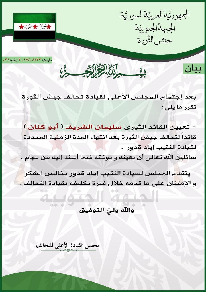 جيش الثورة يعلن تعيين سليمان الشريف ( أبو كنان ) قائداً عاماً لتحالف جيش الثورة
