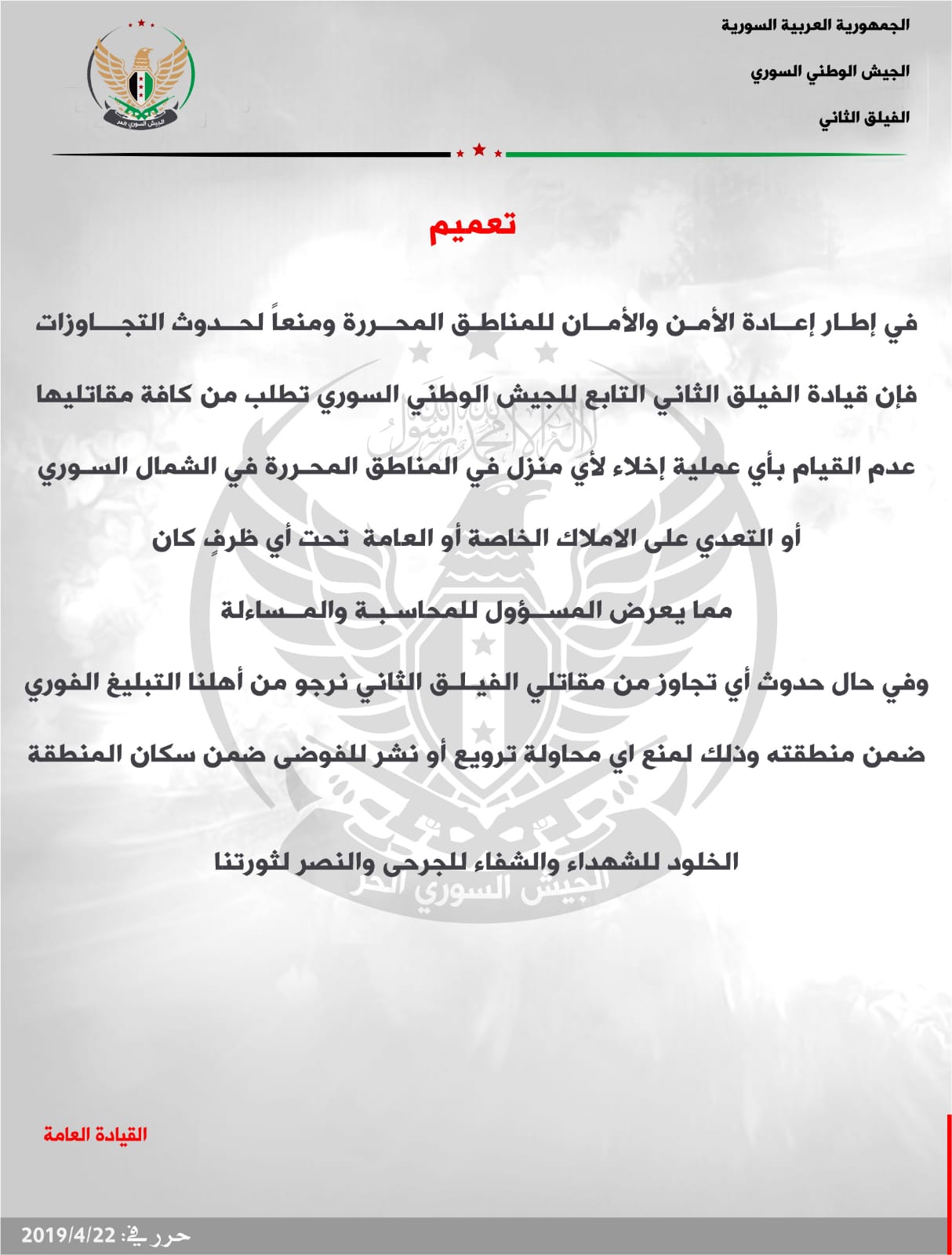 الفيلق الثاني طلب من مقاتليه عدم القيام بأي عملية إخلاء للمنازل في المناطق المحررة تحت طائلة المسؤولية