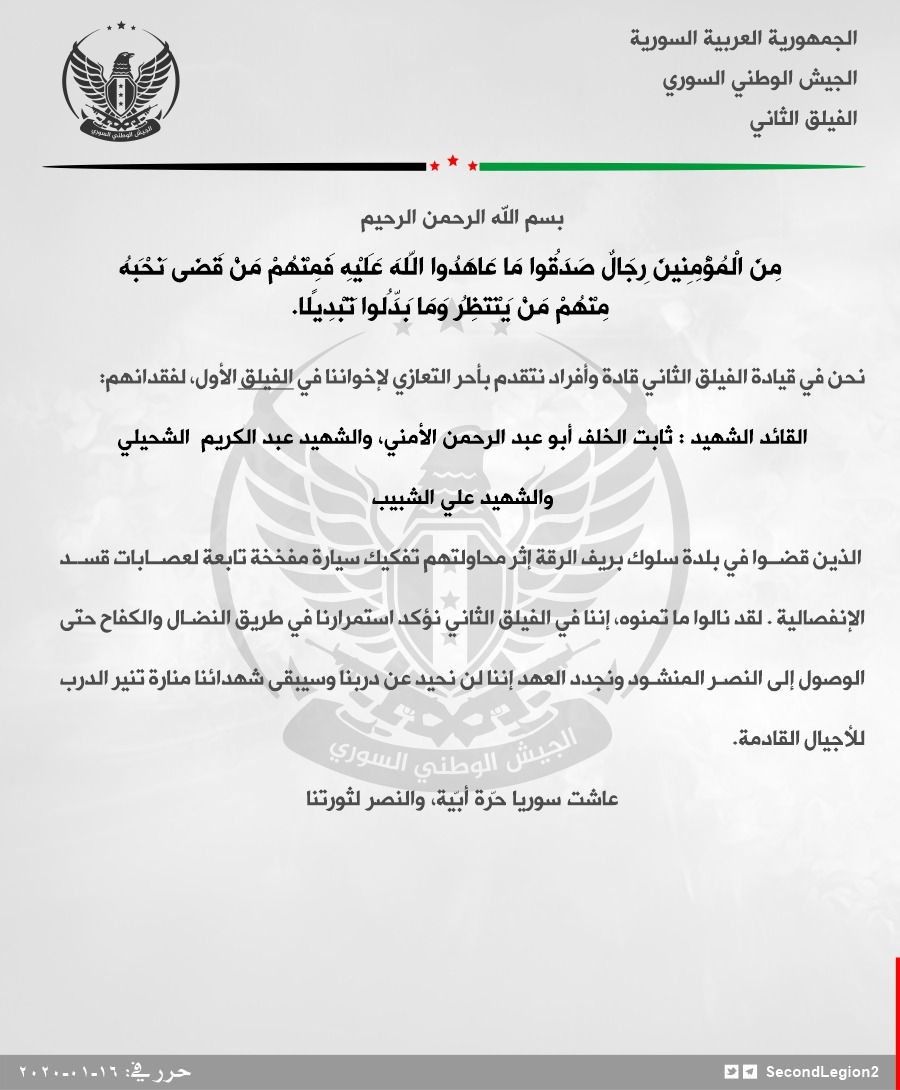 الفيلق الثاني يعزي الفيلق الأول بعدد من عناصره أثناء محاولتهم تفكيك سيارة مفخخة في بلدة سلوك