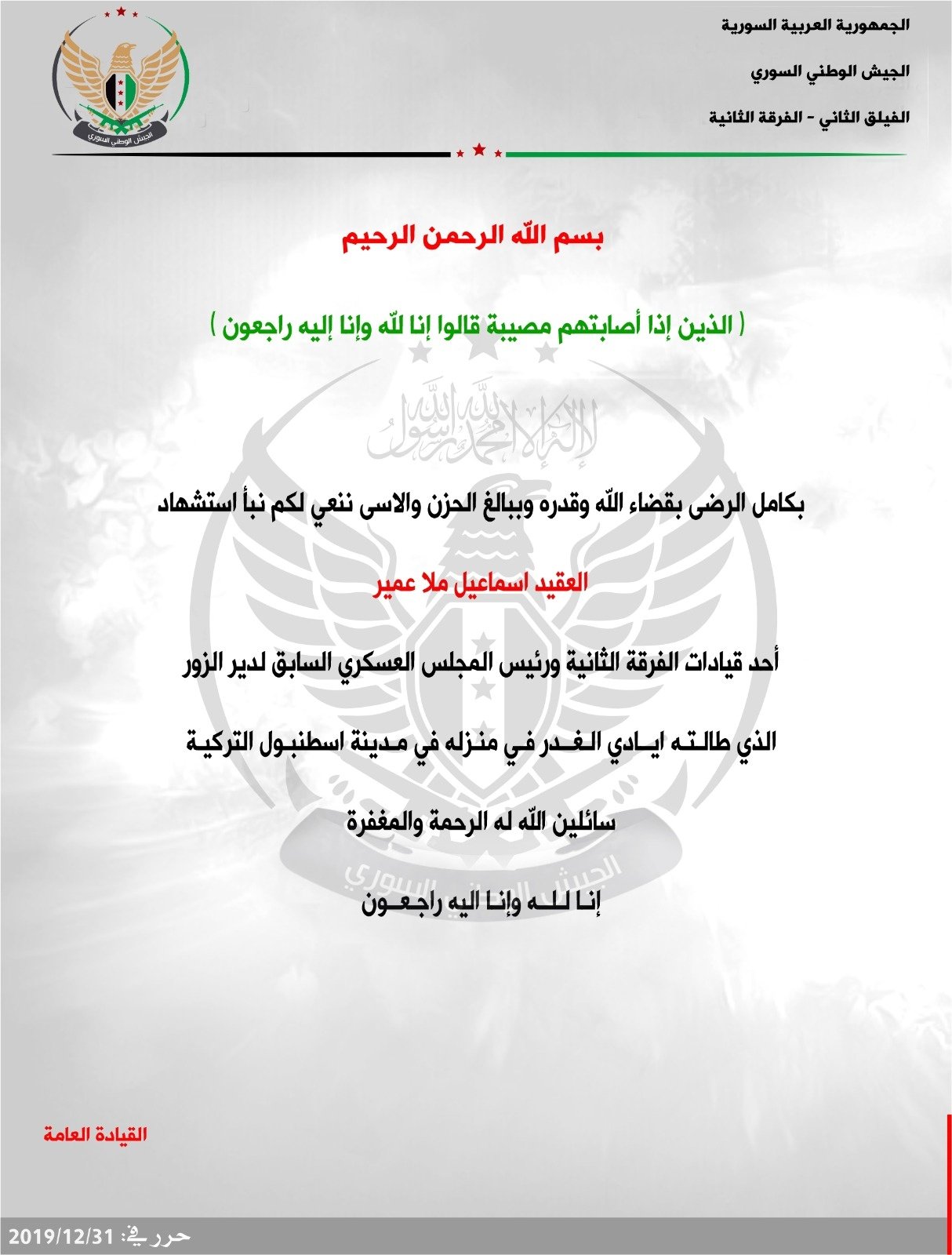 الفيلق الثاني ينعي العقيد إسماعيل ملا عمير أحد قيادات الفرقة الثانية والقائد السابق للمجلس العسكري في دير الزور