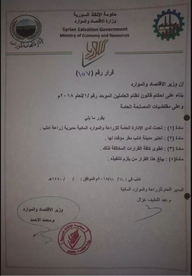 وزارة الاقتصاد في حكومة الإنقاذ تستحدث مديرية زراعة إدلب على أن تكون مدينة إدلب مقراً مؤقتاً لها
