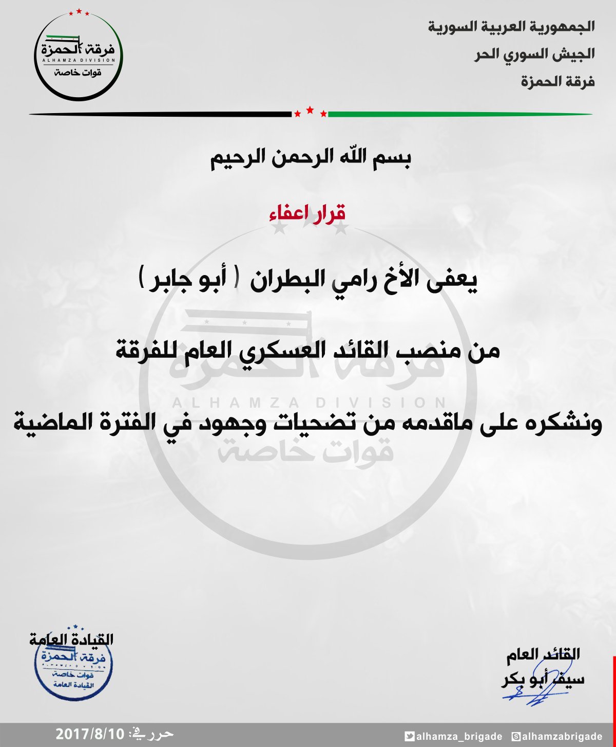 فرقة الحمزة تعفي ( رامي البطران أبو جابر ) من منصب القائد العسكري للفرقة