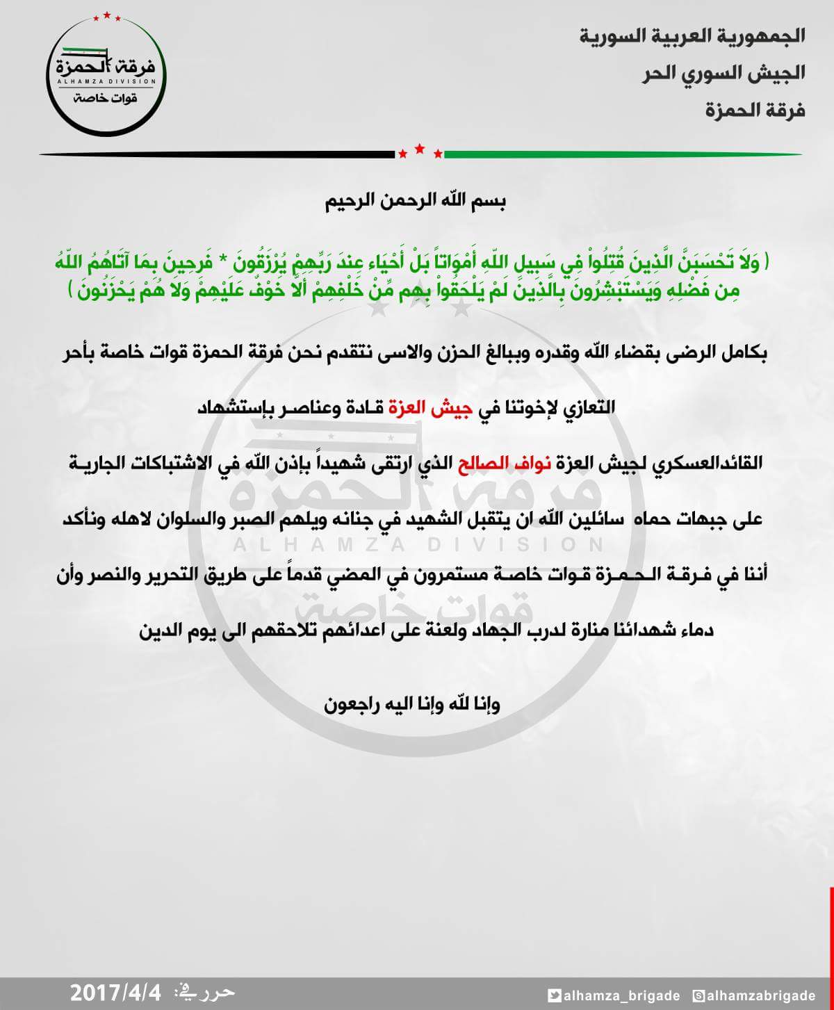 فرقة الحمزة تعزي جيش العزة بقائده العسكري نواف الصالح
