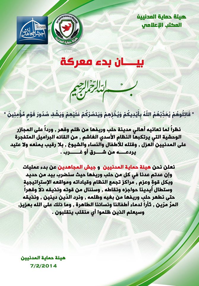 نعلن نحن " #هيئة_حماية_المدنيين " و " #جيش_المجاهدين " عن بدء عمليات "#وإن_عدتم_عدنا " في كل من #حلب و#ريفها , حيث سنضرب بيد من حديد وبكل قوةٍ وعزم , مراكز تجمع النظام وقياداته ومواقعه الإستراتيجية , وستطال أيدينا حواجزه ونقاطه , وسننال من قوته ونذيقه ذلاً وقهراً , حتى نطهر حلب وريفها من بغيه وظلمه , ونرد الدّين دينين , ونذيقه المرَّ مرّين , ثأراً لدماء أطفالنا ونسائنا الطاهرة , وما ذلك على الله بعزيز , وسيعلم الذين ظلموا أي منقلب ينقلبون .