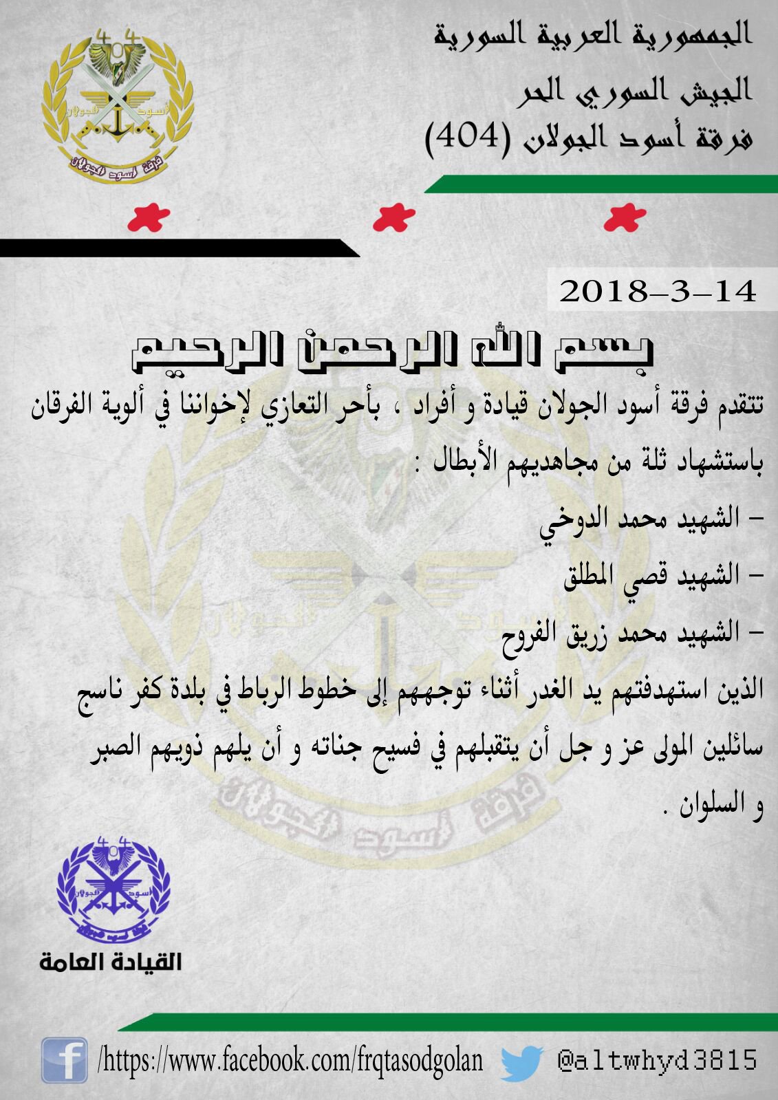فرقة أسود الجولان 404 تعزي ألوية الفرقان بعدد من عناصرهم