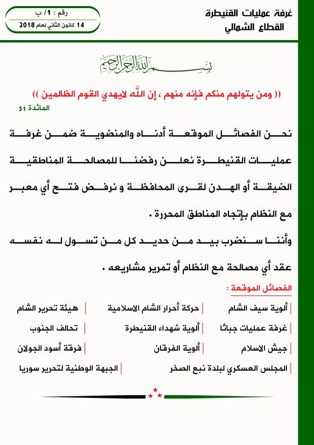 غرفة عمليات القنيطرة ترفض ما يروج له من مصالحات ضيقة وهدن مع النظام، وترفض فتح أي معبر باتجاه مناطق النظام