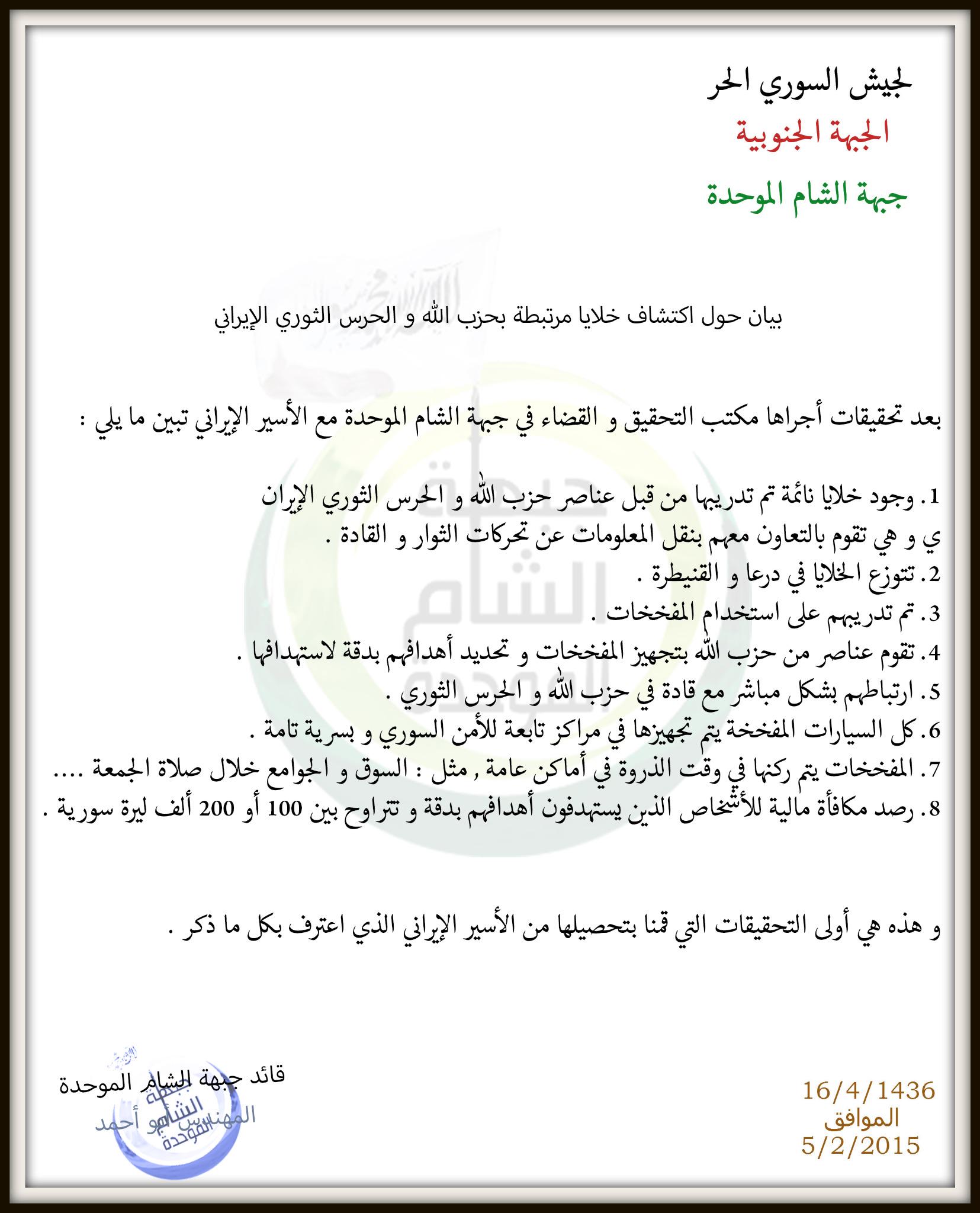 بيان من جبهة الشام الموحدة حول اكتشافها خلايا مرتبطة بحزب والحرس الثوري الإيراني
