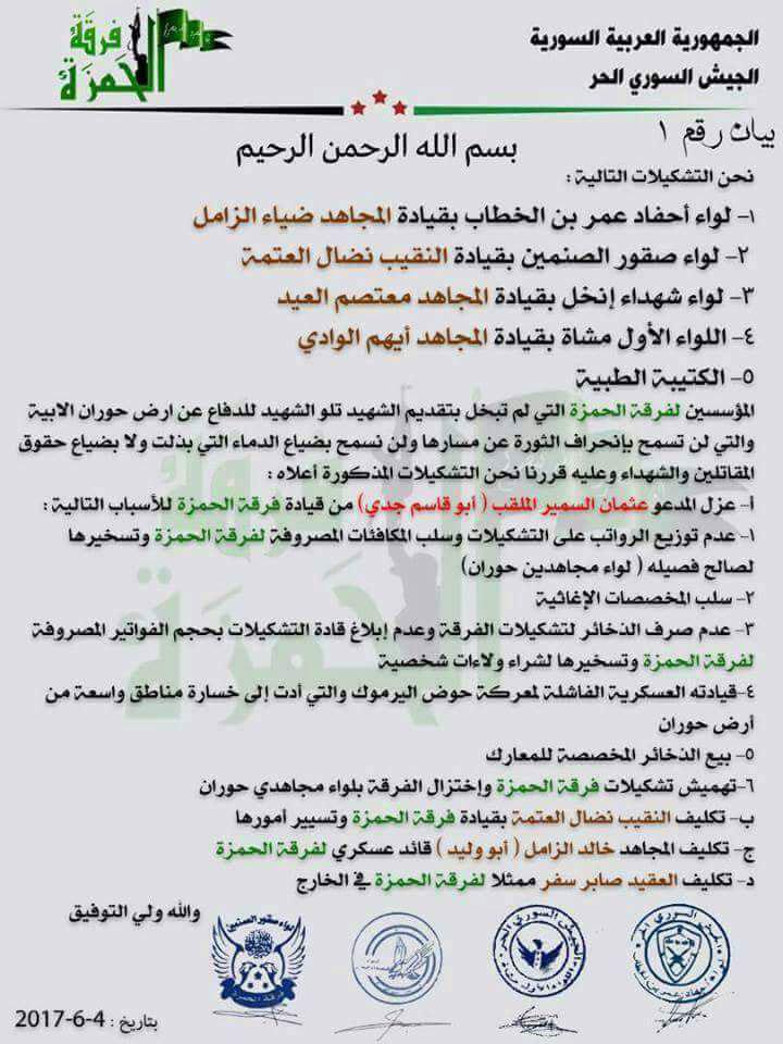 فرقة الحمزة في درعا تقرر عزل قائدها ( عثمان السمير الملقب أبو قاسم الجدي ) وتعيين النقيب ( نضال العتمة ) قائداً لها