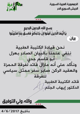 قيادة الكتيبة الطبية التابعة لفرقة الحمزة تنفي علمها بقرار عزل ( أبو قاسم جدي ) من قيادة فرقة الحمزة في درعا وتؤكد أنه مازال القائد للفرقة