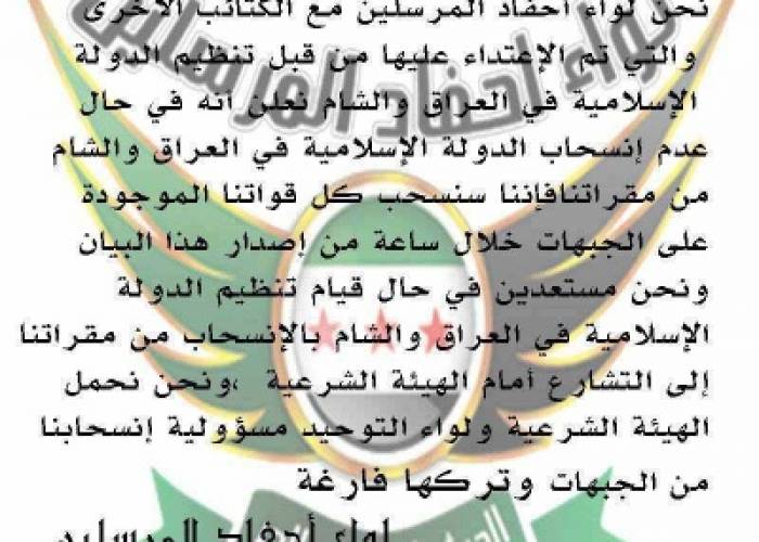 لواء "أحفاد المرسلين" يطالب "الدولة" بالانسحاب من مقراته في حلب