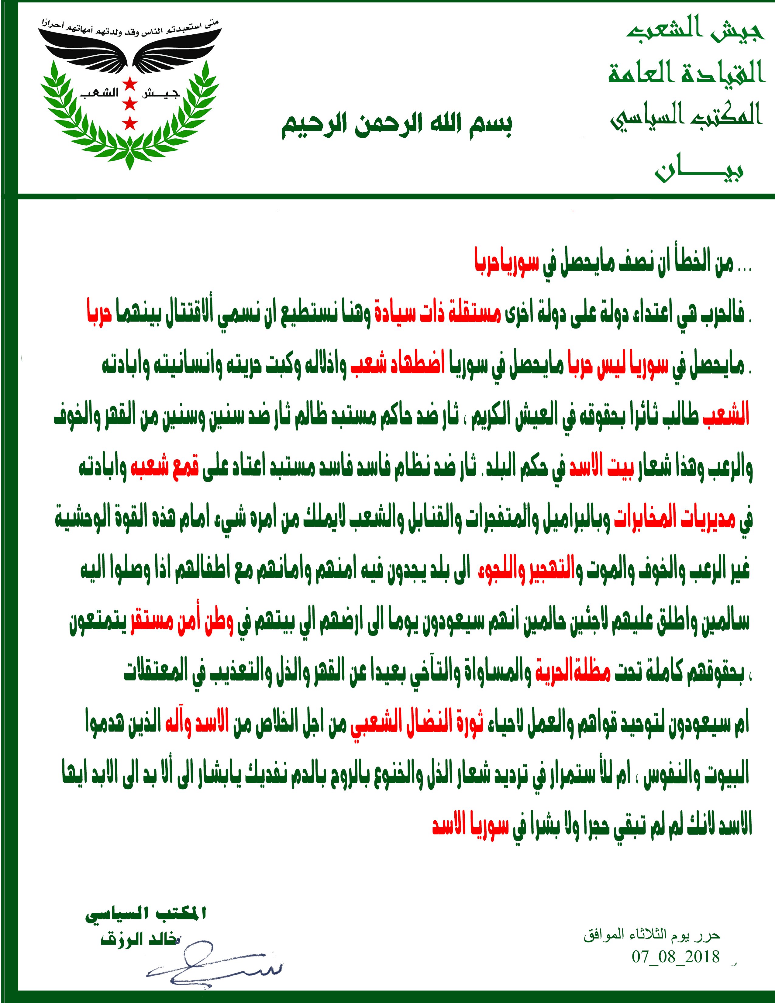 بيان المكتب السياسي لجيش الشعب حول إطلاق كلمة حرب على ما يجري في سوريا
