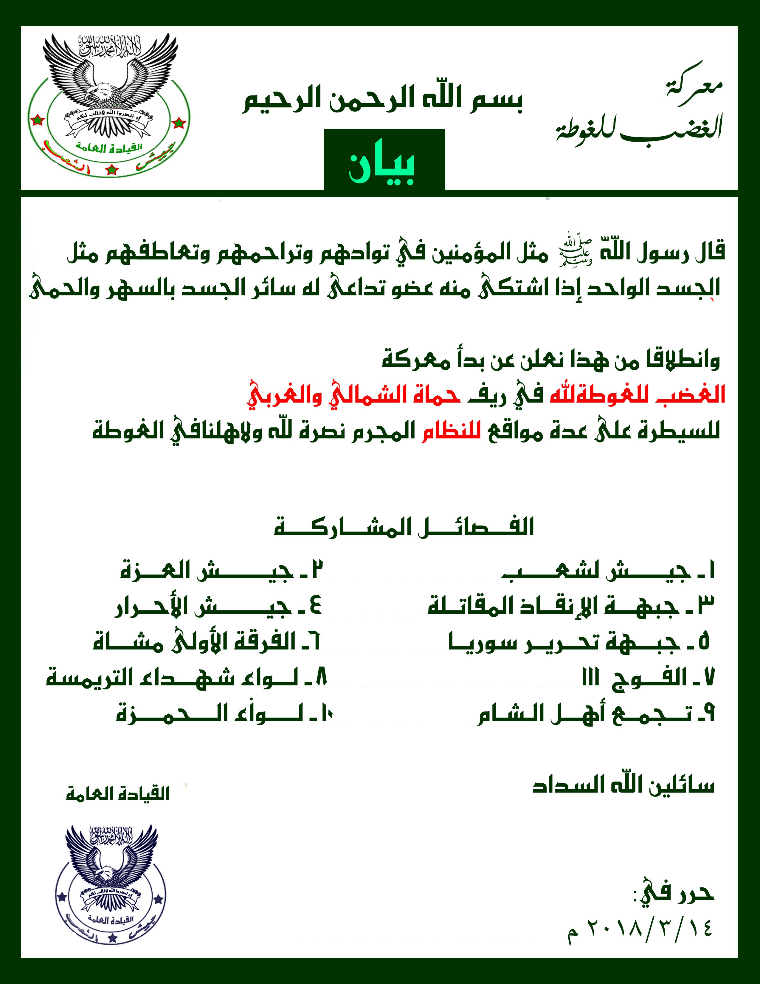 جيش الشعب يعلن إنطلاق معركة الغضب للغوطة ضد قوات النظام في ريف حماة الشمالي والغربي