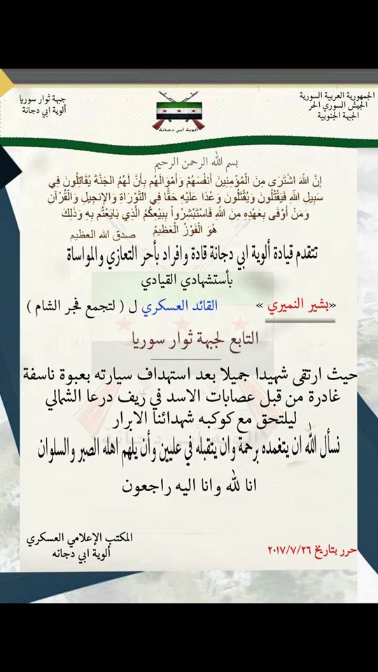 ألوية أبو دجانة تعزي تجمع فجر الشام التابع لجبهة ثوار سوريا بقائده العسكري بشير النميري