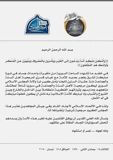وإننا في الاتحاد الإسلامي لأجناد الشام وفي جيش المجاهدين نعتبر هذا المجلس الكريم مرجعية شرعية ارتضيناها لنا.