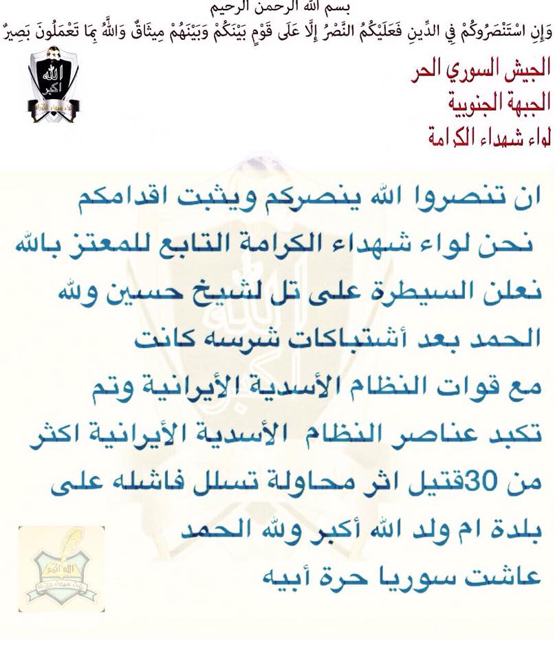 بيان من لواء شهداء الكرامة يعلن فيه السيطرة على تل الشيخ حسين