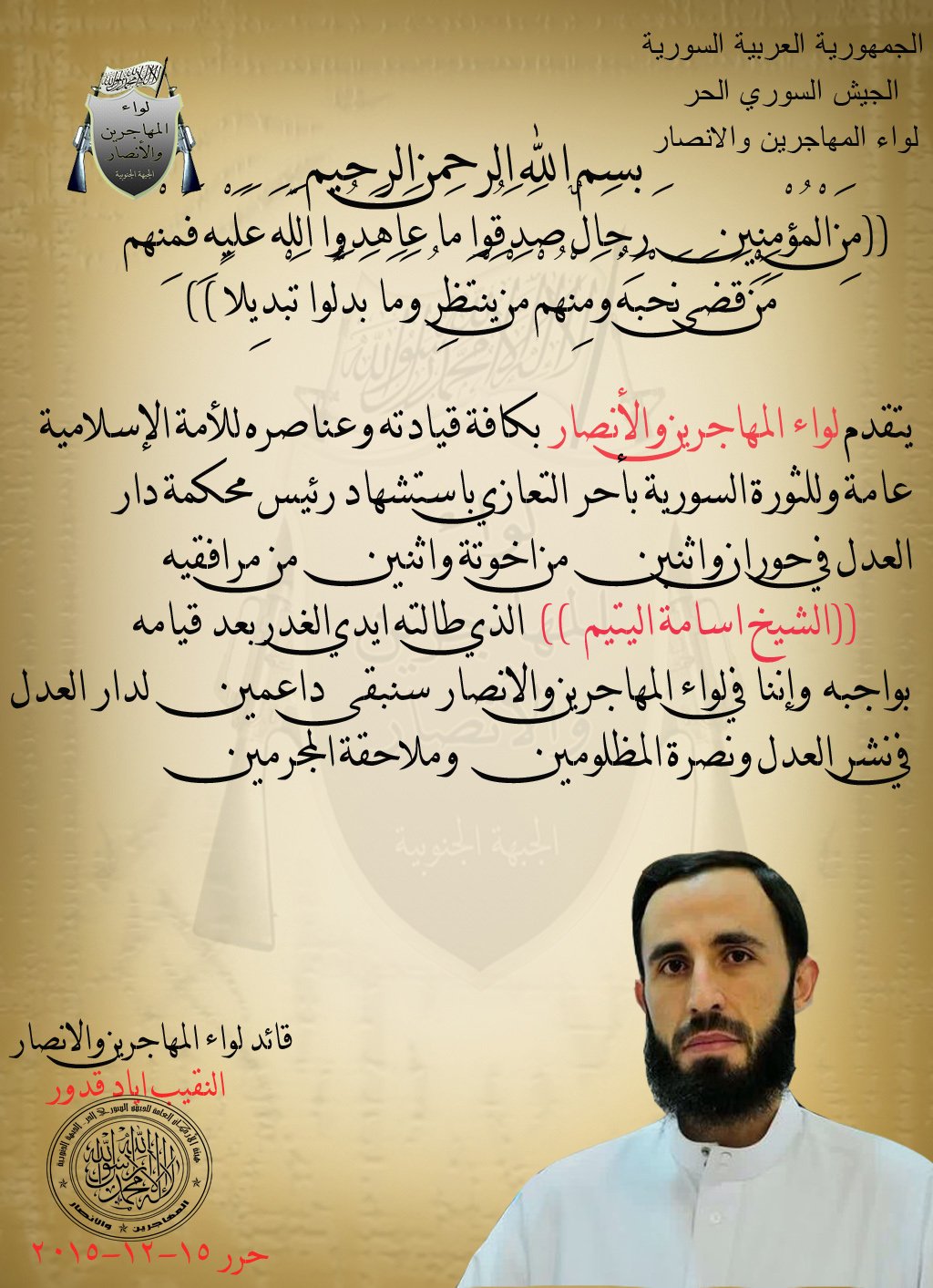 لواء المهاجرين والأنصار يعزي برئيس محكمة دار العدل في حوران الشيخ أسامة اليتيم
